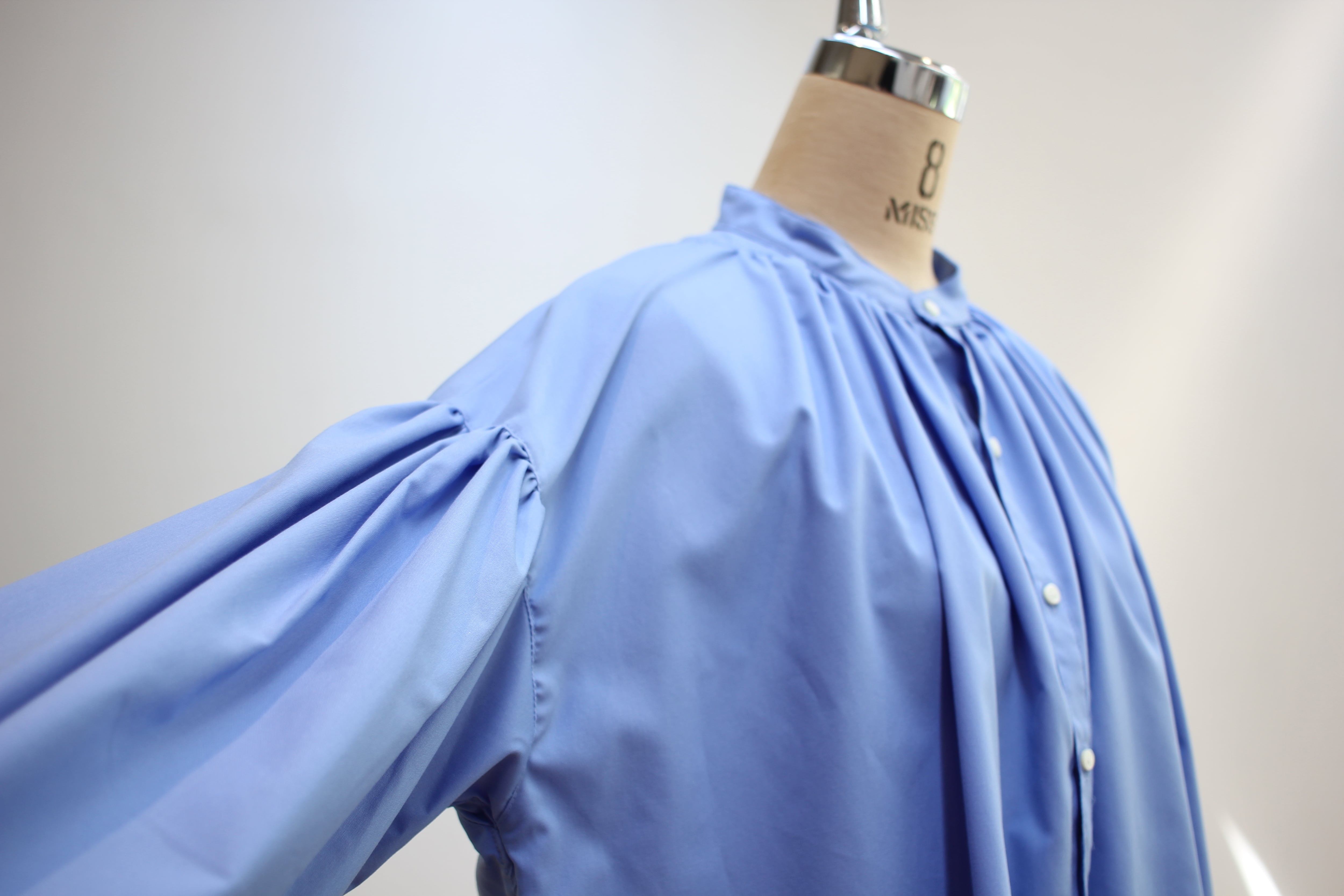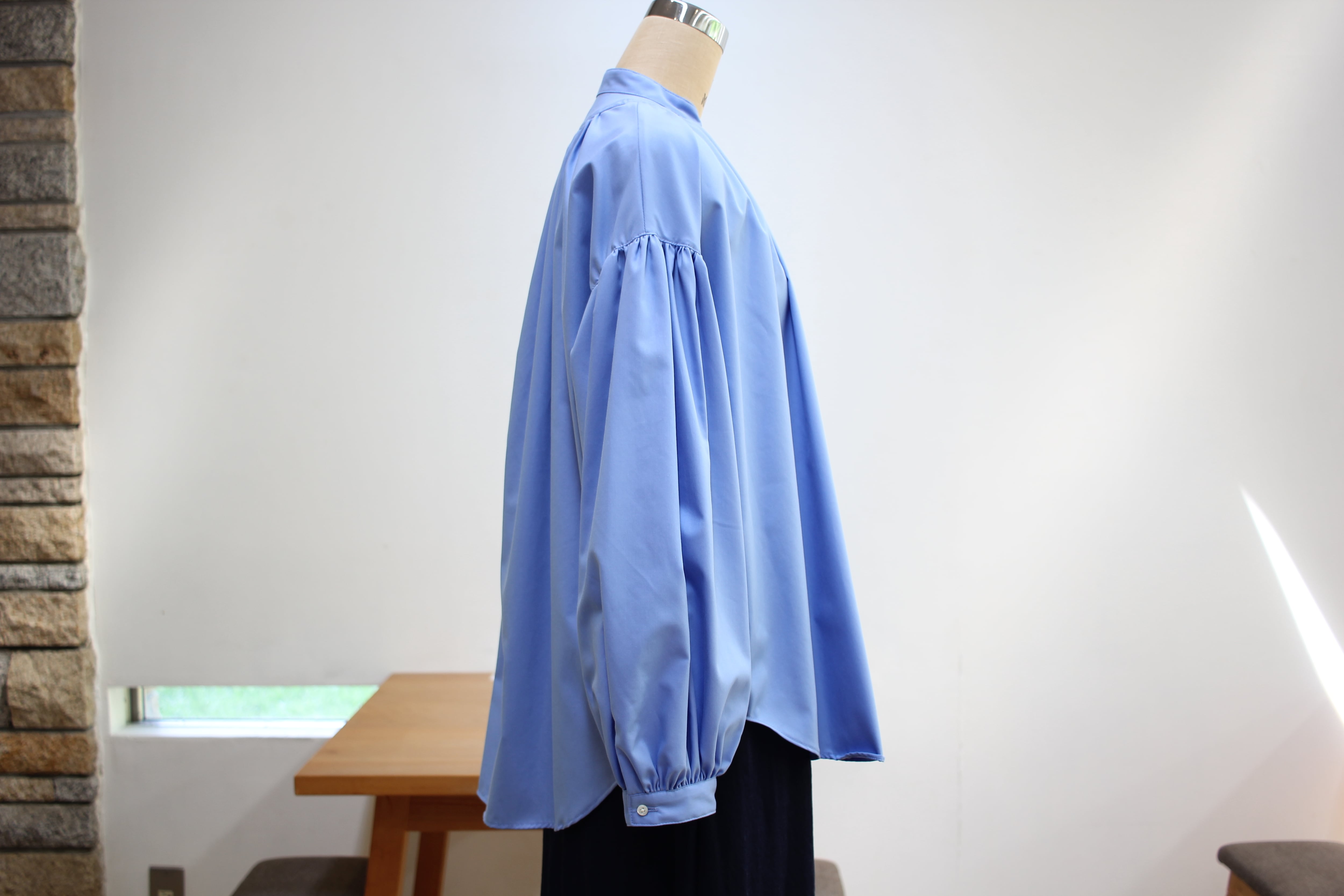 MANON定番の襟周りから後ヨーク、袖口にたっぷりギャザーが入った女性らしいシルエットのアミカルシャツ。