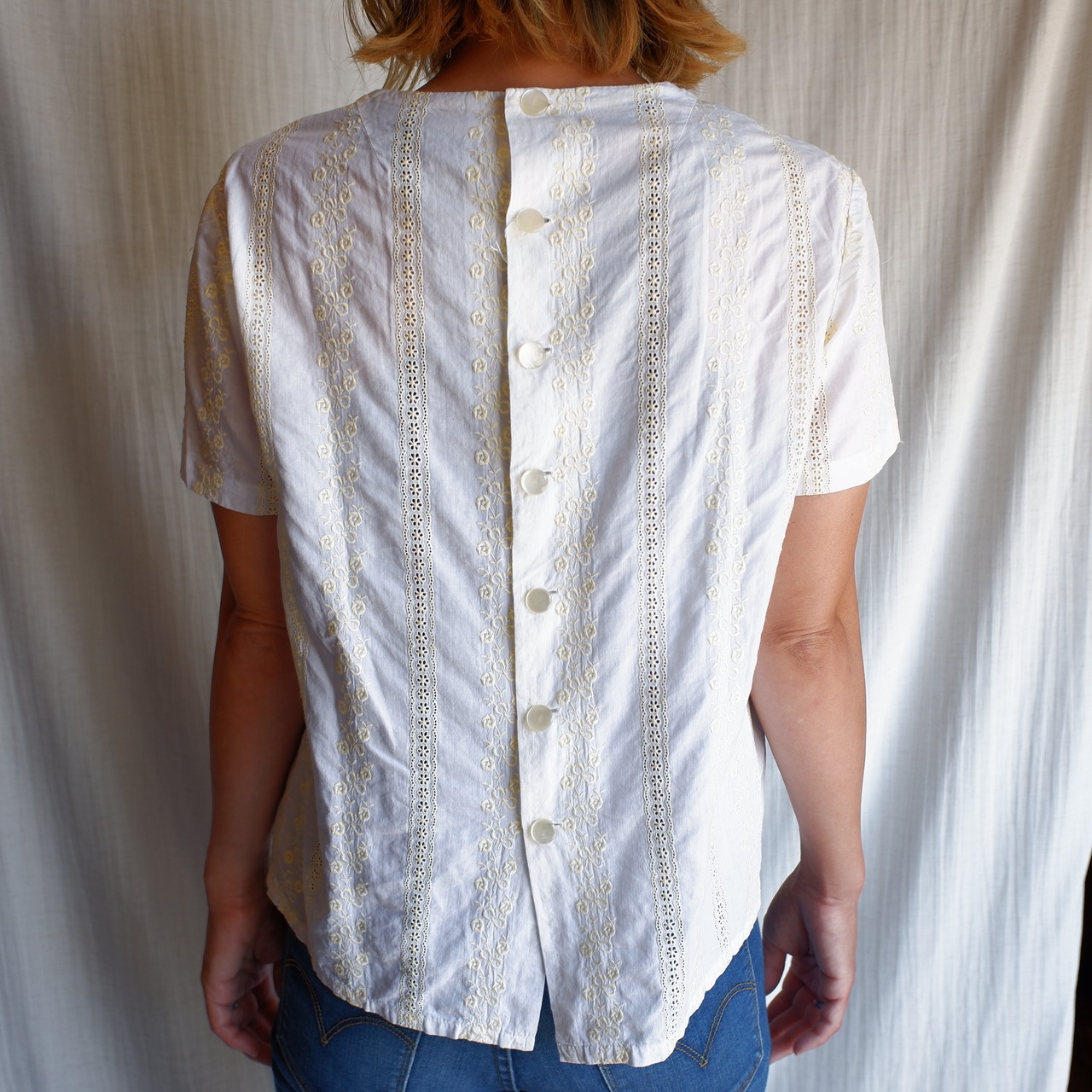 淡いレモンイエローでお花の刺繍が入ったブラウス。