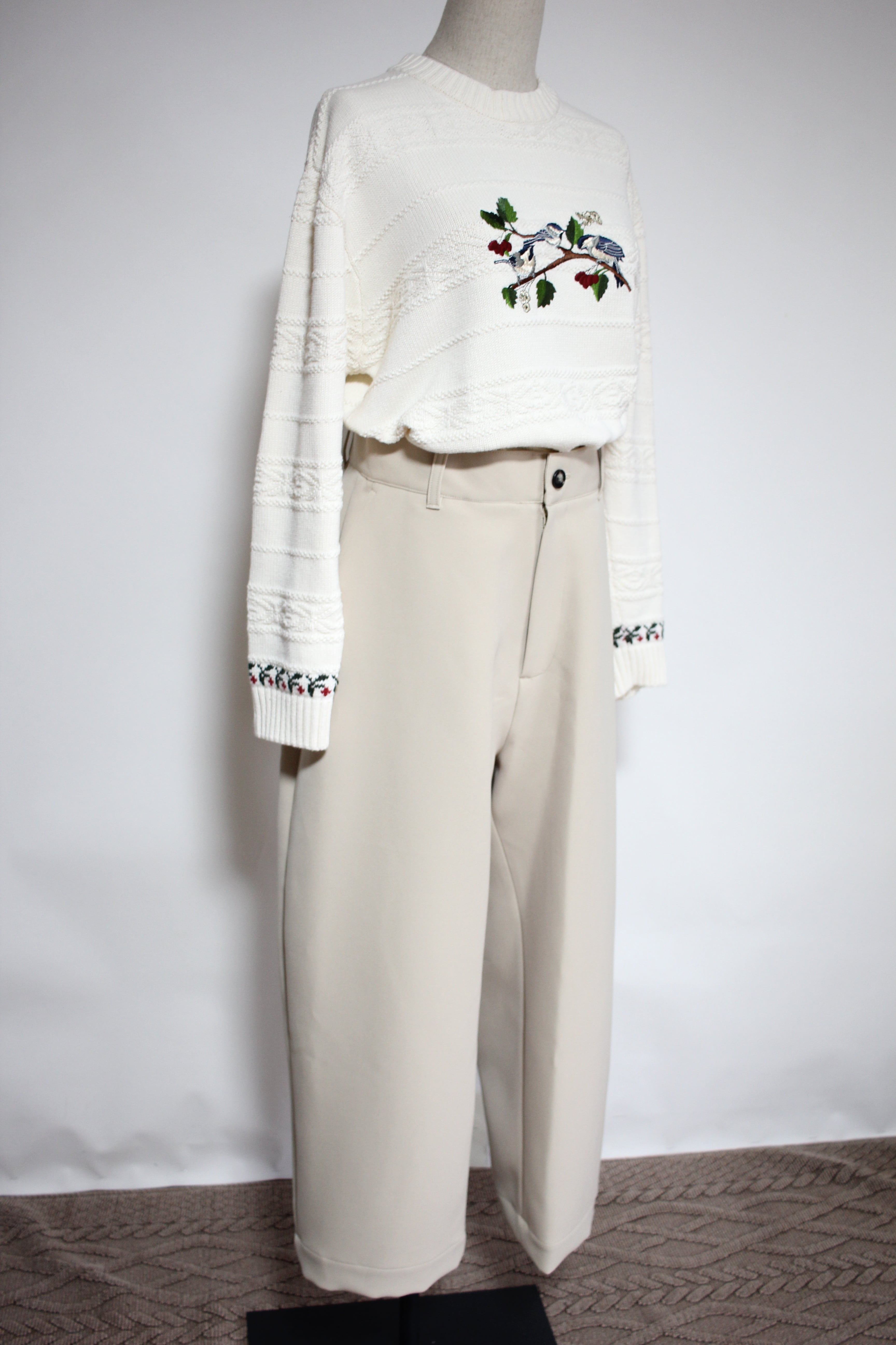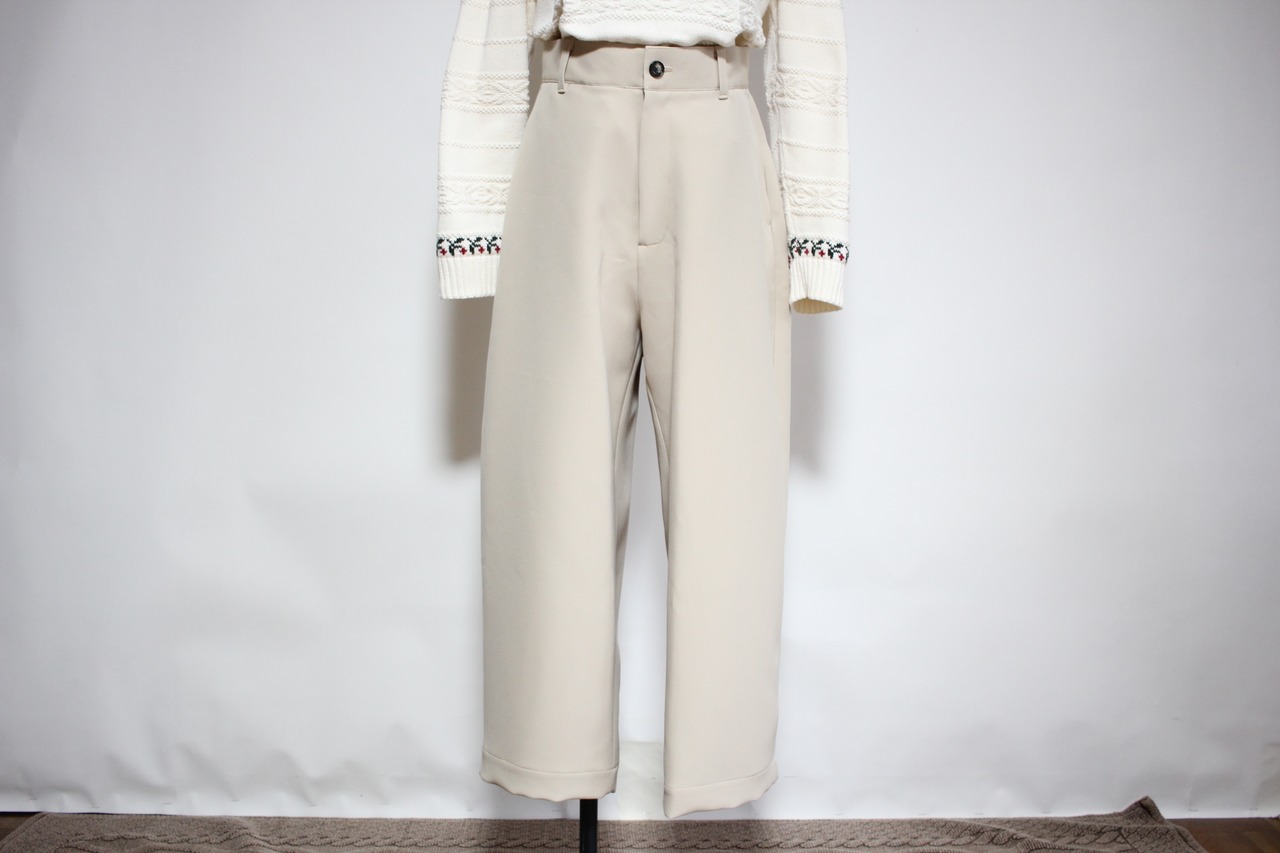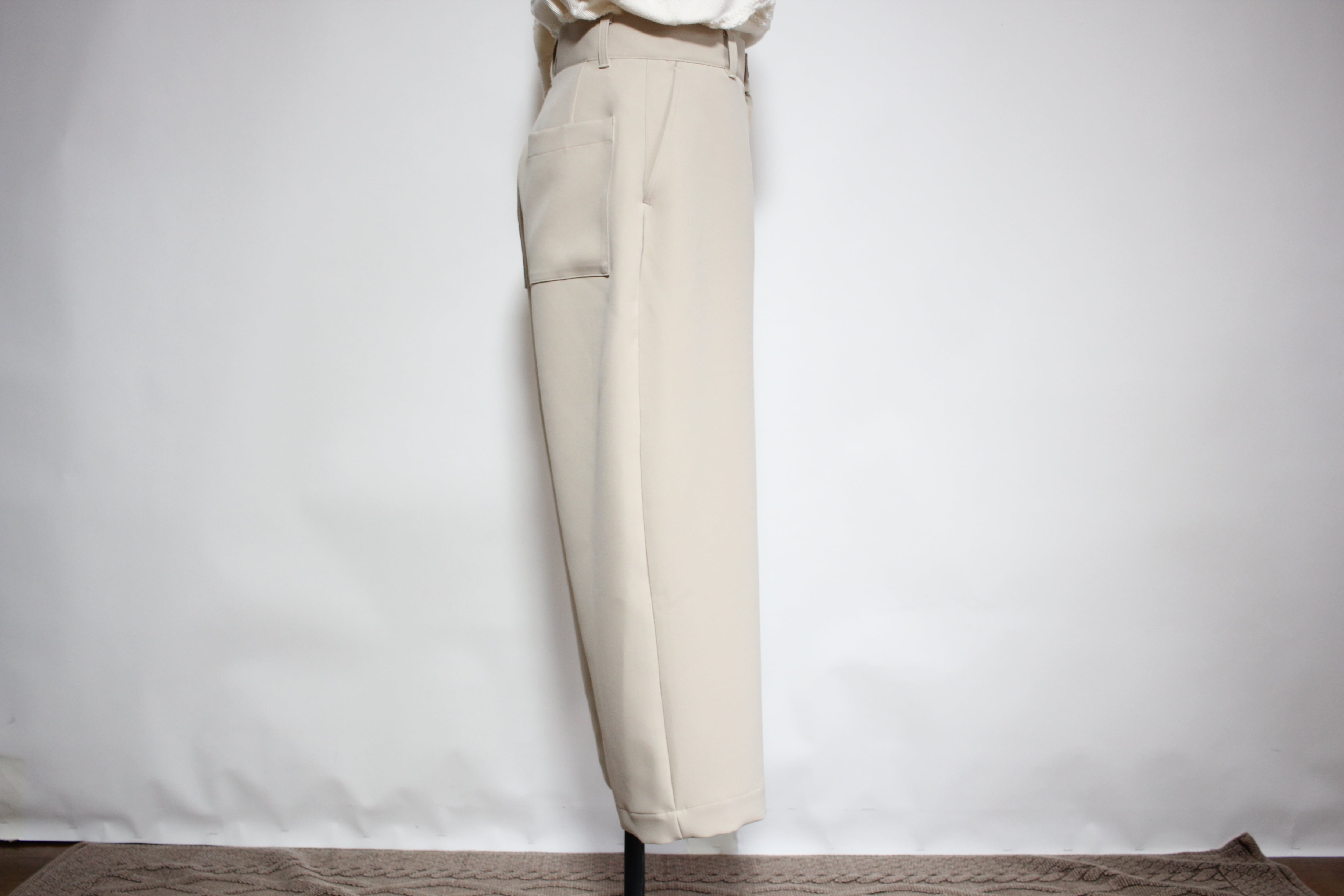 ウエストはジャストサイスで釦+ファスナー開き、ポケットと後ろパッチポケット付きで、ハリ感のある生地がきれいなシルエットのパンツです。